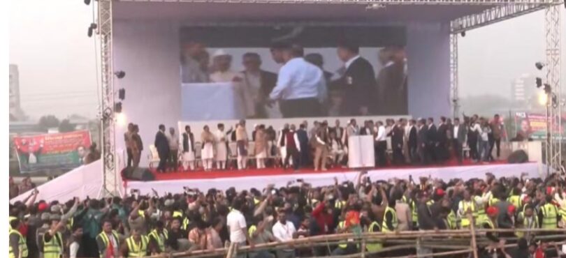 বিএনপির ভারপ্রাপ্ত চেয়ারম্যান তারেক রহমানের গণসংবর্ধনা অনুষ্ঠানে উপস্থিত হয়েছেন যুগপৎ আন্দোলনের নেতারা