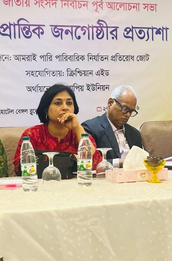 ইউরোপীয় ইউনিয়নের অর্থায়নে এবং ক্রিশ্চিয়ান এইড-এর সহযোগিতায় আয়োজিত এই সভায় আমন্ত্রিত বক্তারা তৃণমূল পর্যায়ে বৈষম্য দূরীকরণ এবং আসন্ন নির্বাচনে প্রান্তিক মানুষের অংশগ্রহণ নিশ্চিত করার ওপর গুরুত্বারোপ করেন। অনুষ্ঠানে বিভিন্ন রাজনৈতিক দলের প্রতিনিধি, সাংবাদিক এবং নাগরিক সমাজের বিশিষ্ট ব্যক্তিবর্গ উপস্থিত ছিলেন। পুরো অনুষ্ঠানটি সঞ্চালনা করেন ‘আমরাই পারি’ জোটের প্রধান নির্বাহী জিনাত আরা হক।